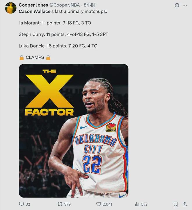 本賽季雷霆6名球員場(chǎng)均搶斷超過(guò)1次:卡森-華萊士(2.3)、卡魯索(2.1)、阿杰伊-米切爾(1.9)、亞歷山大和哈滕(均是1.3)、多爾特(1)。過(guò)去3場(chǎng)比賽,卡森-華萊士對(duì)位莫蘭特、庫(kù)里和東契奇時(shí),他們?nèi)齻€(gè)合計(jì)51投14中。